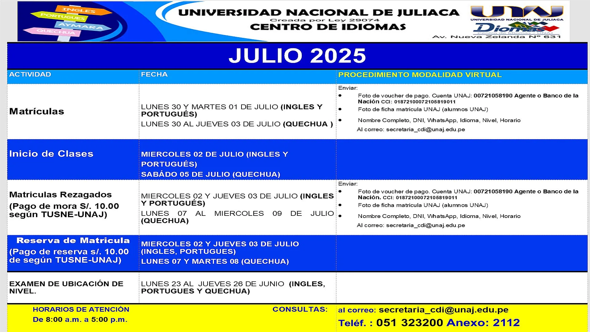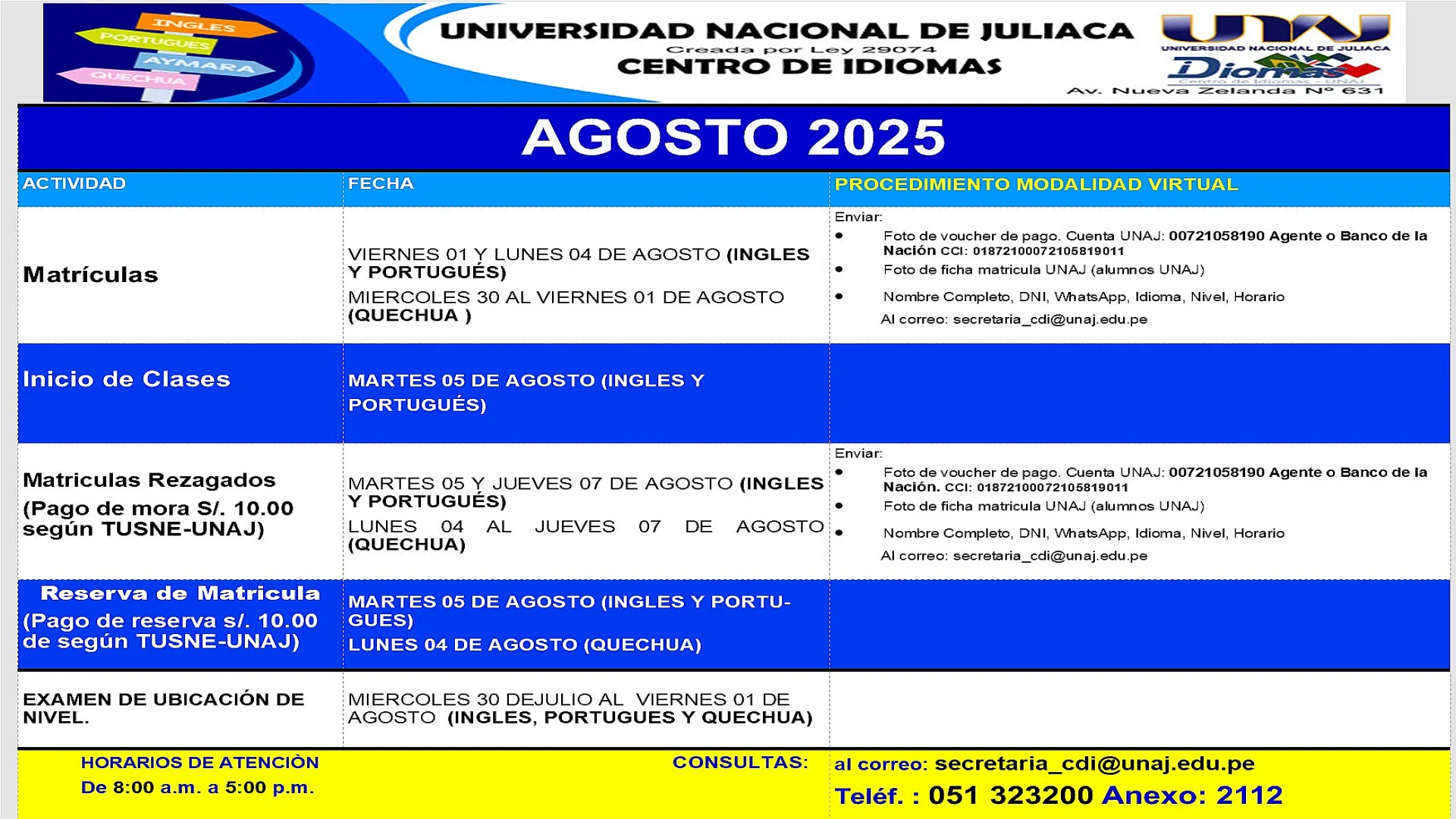 El Centro de idiomas imparte los programas académicos de los idiomas extranjeros Inglés y Portugués como las lenguas originarias de Quechua y Aymara, los cuales están estructurados en ciclos, que corresponde a los niveles: Básico, Intermedio y Avanzado, y se llevan de manera mensual de conformidad al calendario institucional anual de Centro de Idiomas; cuya finalidad es de obtención de Certificado y del Diploma.