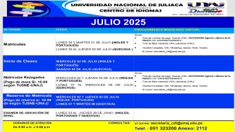 El Centro de idiomas imparte los programas académicos de los idiomas extranjeros Inglés y Portugués como las lenguas originarias de Quechua y Aymara, los cuales están estructurados en ciclos, que corresponde a los niveles: Básico, Intermedio y Avanzado, y se llevan de manera mensual de conformidad al calendario institucional anual de Centro de Idiomas; cuya finalidad es de obtención de Certificado y del Diploma.